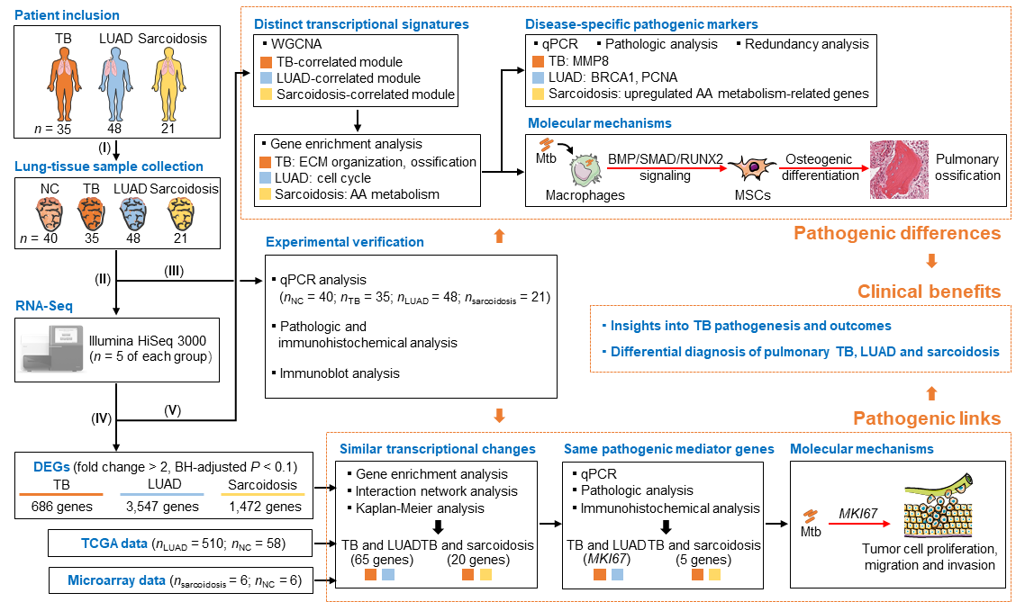 Besides causing TB, Mtb infection has long been associated with the development of both lung cancer and sarcoidosis. Internationally, lung cancer is the leading cause of cancer-related death in humans, among which lung adenocarcinoma (LUAD) is the most common histologic subtype. Sarcoidosis is a common autoimmune disease that preferentially affects the lungs and lymph glands, and has recently been linked to TB infection. However, the pathogenic links and molecular markers for the above three mentioned diseases have not been elucidated. More importantly, pulmonary TB could mimic lung cancer or sarcoidosis in some cases, which may challenge the diagnosis and delay the treatment. Recently, Dr. Cui Hua Liu's group revealed lung transcriptional signatures of pulmonary tuberculosis, adenocarcinoma and sarcoidosis. On the one side, Dr. Liu’s team found that TB shares a set of potential pathogenic mediators with LUAD or sarcoidosis, and further demonstrated that host MKI67, an over-expressed gene shared by TB and LUAD, is involved in Mtb-promoted tumor cell proliferation, migration and invasion. On the other side, they unraveled distinct lung modular signatures and molecular markers of TB, LUAD and sarcoidosis, andverified an ossification-related TB lung signature, which is probably associated with the activation of BMP/SMAD/RUNX2 pathway in Mtb-infected macrophages that controls mycobacterial survival and promotes osteogenic differentiation of mesenchymal stem cells. These findings provide new insights into Mtb pathogenesis and may contribute to differential diagnosis of TB, LUAD and sarcoidosis.