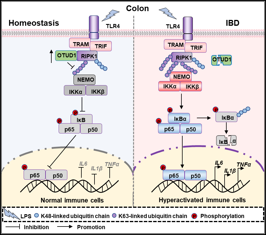 Recently, Dr. Cui Hua Liu’s group, in collaborating with Dr. Lingqiang Zhang (from National Center for Protein Sciences, Beijing), have revealed that OTUD1 interacts with receptor-interacting serine/threonine protein kinase 1 (RIPK1) and deubiquitinates K63-linked polyubiquitin chains of RIPK1 at lysine 627, which inhibits the recruitment of NF-κB essential modulator (NEMO) and the activation of NF-κB signaling pathway, leading to the suppression of proinflammatory cytokines production and intestinal inflammation (Figure 1). Firstly, this study shows that the expression of OTUD1 is upregulated upon dextran sulfate sodium (DSS) administration and loss of Otud1 in mice contributes to the pathogenesis of DSS-induced colitis with excessive release of proinflammatory cytokines, including TNF-α, IL-6 and IL-1β. Then, bone marrow transplantation experiments reveal that OTUD1 in hematopoietic cells plays a dominant role in the protection against colitis. Mechanistically, LPS-induced hypomethylation of OTUD1 promoter region facilitates its upregulation. OTUD1 subsequently interacts with receptor-interacting serine/threonine-protein kinase 1 (RIPK1) and selectively cleaves the K63-linked polyubiquitin chains from RIPK1 to inhibit the recruitment of NF-κB essential modulator (NEMO). Moreover, the expression of OTUD1 in the mucosa samples of ulcer colitis (UC) patients is lower than that in healthy controls. Finally, this study demonstrates that UC-associated OTUD1 G430V mutant abolishes its ability to inhibit RIPK1-mediated NF-κB activation and intestinal inflammation.