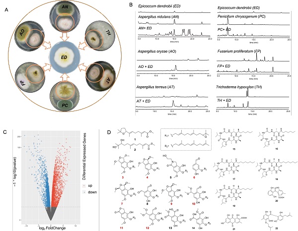 Figure 1. The general cocultivation systems trigger by E. dendrobii (A and B); The widespread alteration of transcription and secondary metabolism in A. nidulans triggered by E. dendrobii(C and D) (Image by Dr. YIN’s group)