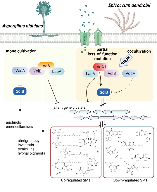Cocultivation of E. dendrobii with A. nidulans carrying the veA1 allele led to widespread alteration of secondary metabolism, representing a new example for pathway activation. Partial loss-of-function of VeA (VeA1) is crucial for fungal chemical signal transduction triggered by cocultivation.