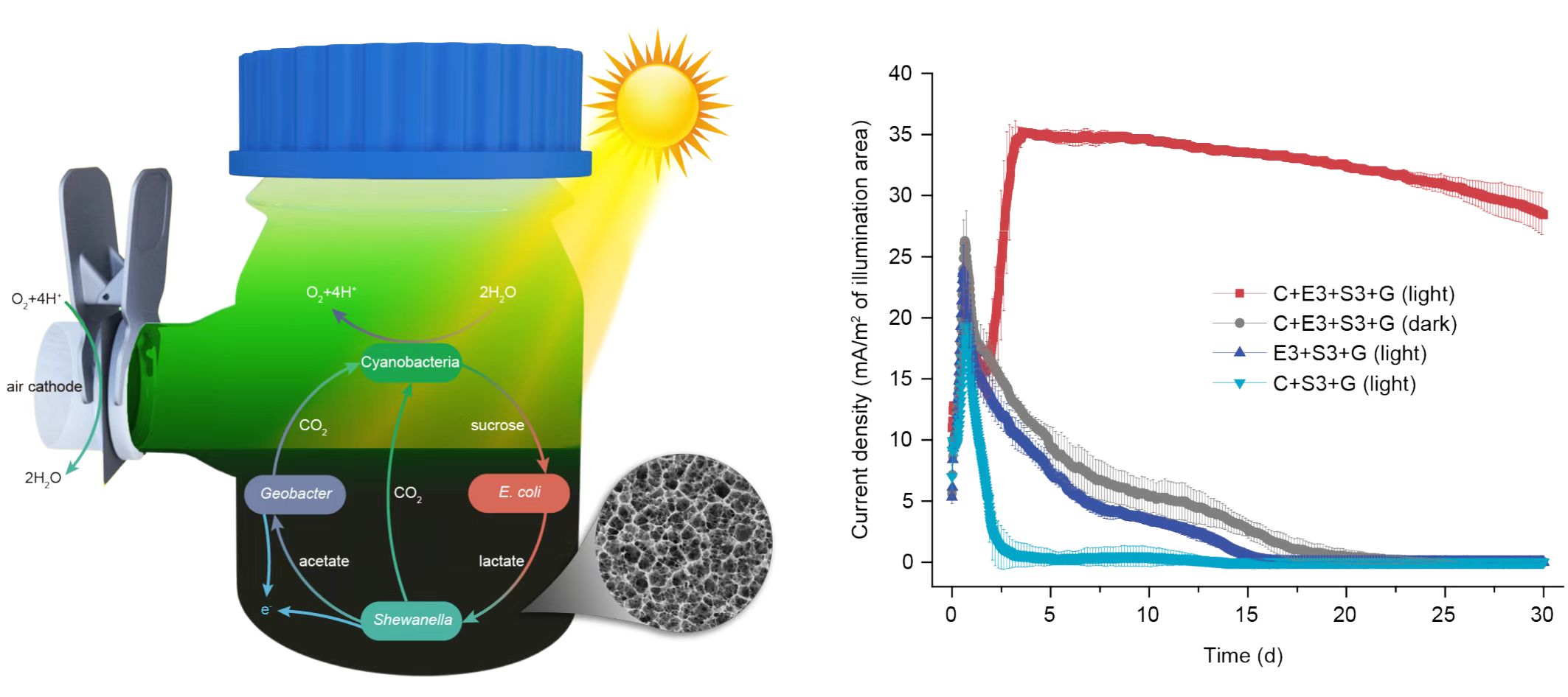 By assembling the artificial sediment layer containing primary degrader (E. coli) and ultimate consumers (S. oneidensis and G. sulfurreducens) with a water column layer containing primary producer (cyanobacteria), the researchers eventually assembled an integrated bio-solar cell that directly converts light into electricity for over one month (Fig. 1).