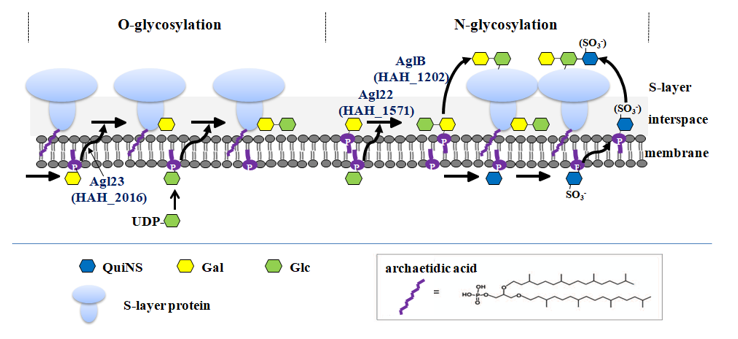 Figure 1. Identification of the pathway for glycostylation of the S-layer protein in Har. hispanica (Glycobiology, 2015; Molecular Microbiology, 2020).
