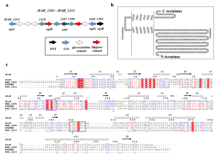 In recent years, the study of extremophiles has gained increasing attention, not only from an evolutionary point of view but also for exploring the function of polysaccharides produced by these microorganisms. Using an extremely halophilic archaeon Haloarcula hispanica as a model, previously Prof. Jin’s research group characterized the protein glycosylation (Glycobiology, 25: 1150, 2015) and identified the genes invovled in protein glycosylation, including a novel flippase Agl23 (Molecular Microbiology, 114: 762, 2020) (Figure 1). They also found that Har. hispanica can produce an acidic exopolysaccharides (EPS) and identified two genes (HAH_1662 and HAH_1667) are involved in the synthesis of the acidic EPS (Archaea, 2017). However, the complete pathway for synthesis of this EPS remains to be investigated.