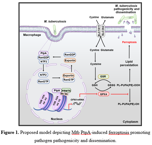 Recently, Jing Wang's group and Cui Hua Liu's group in collaborating with Lingqiang Zhang's group (State Key Laboratory of Proteomics, National Center for Protein Sciences (Beijing), Beijing Institute of Lifeomics) have revealed that Mtb PtpA induces host cell ferroptosis through targeting epigenetic modification, thus enhancing the pathogenicity and dissemination of Mtb (Figure 1). Specifically, in vitro screening experiments and transcriptomic analysis identified Mtb PtpA as an important effector protein involved in host cell ferroptosis induction. Further investigation revealed that Mtb PtpA is located in both cytoplasm and nucleus of host cell during mycobacterial infection. It is worth mentioning that PtpA does not contain currently identifiable nuclear import motif, but enters the nucleus through the interaction between its Cys site and the nuclear entry transporter Ran/NTF2 complex of the host cell. Subsequently, nuclear PtpA binds to protein arginine methyltransferase 6 (PRMT6) via its 1-50 amino acids region to increase asymmetric dimethylation of histone H3 at arginine 2 (H3R2me2a), thus inhibiting GPX4 transcription and expression. Consistantly, in vivo experiments further confirmed the important regulatory role of PtpA-induced ferroptosis in mediating host tissue damage and pathogen dissemination.