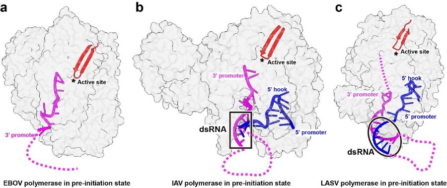 In contrast to the segmented negative-strand viruses (sNSVs) including influenza viruses and bunyaviruses, the EBOV RNA promoter does not bind in a positively charged groove at the peripheral surface of polymerase protein, and instead, the 3’ RNA promoter is directly accommodated in the template entry channel with a distinctive bend conformation, proposed that the polymerases of nsNSVs including EBOV have evolved a different replication initiation mechanism to adapt their RNP structure (Figure 3).