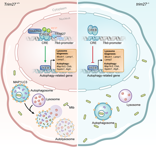 The tripartite motif (TRIM) family proteins are a class of ubiquitin ligases widely involved in cell biological processes. By analyzing the gene expression of TRIM proteins in peripheral blood, researchers found that TRIM27 gene transcription in TB patients was significantly lower than that of healthy individuals. Further Mtb infection experiments showed the level of nuclear TRIM27 increased upon Mtb infection and then the nuclear TRIM27 functioned as a transcription activator to promote the transcription of TFEB (transcription factor EB), a critical regulator promoting autophagy-related gene expression. Specifically, TRIM27 not only binds to the promoter region of TFEB through its DNA-binding motif, but also interacts with the TFEB transcription factor CREB1 (cAMP responsive element binding protein 1) through its RFP domain, thus increasing the affinity of CREB1 to the TFEB promoter and promoting CREB1 transcription activity towards TFEB, eventually enhancing TFEB gene transcription and the ensuing autophagy-related gene expression and autophagy activation to clear Mtb. Furthermore, TFEB activator 1 can rescue the attenuated autophagy flux and reduced Mtb clearance in Trim27-deficient cell and mouse models (Figure).
