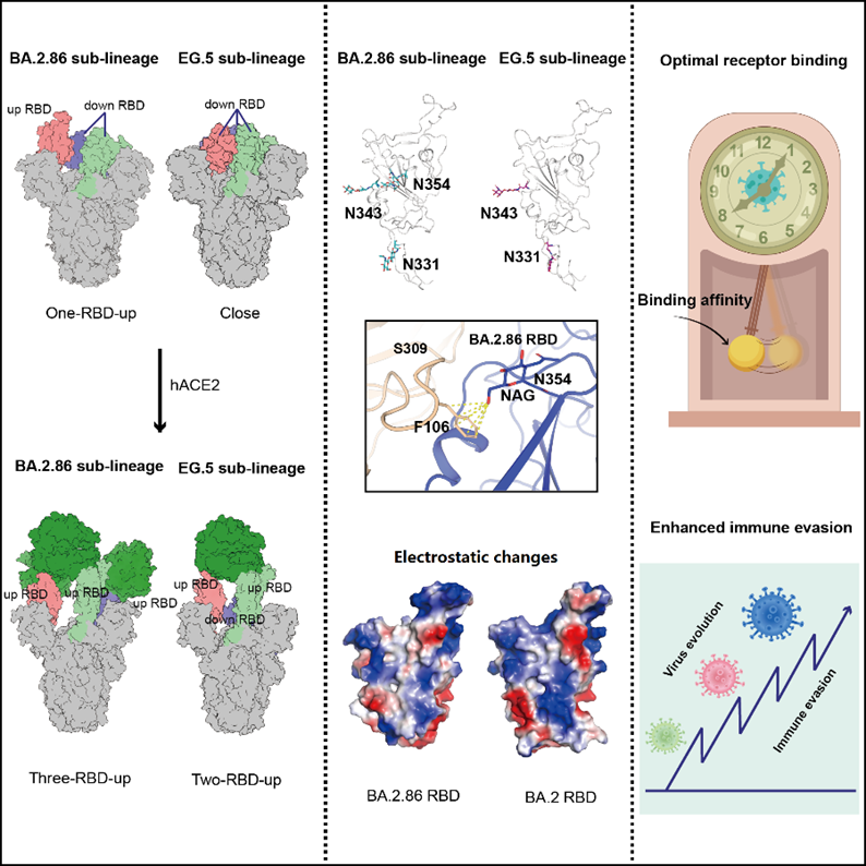 Severe Acute Respiratory Syndrome Coronavirus 2 (SARS-CoV-2) continues to adapt to the herd immunity background and evolves into numerous sub-variants. Prof. George Fu Gao's lab at Institute of Microbiology of Chinese Academy of Sciences (IMCAS) revealed the spike (S) protein structures of the recently emerged BA.2.86, JN.1, EG.5, EG.5.1 and HV.1 variants of SARS-CoV-2, and conducted systematic comparative analysis on these sub-variants. This work was published in Structure.
