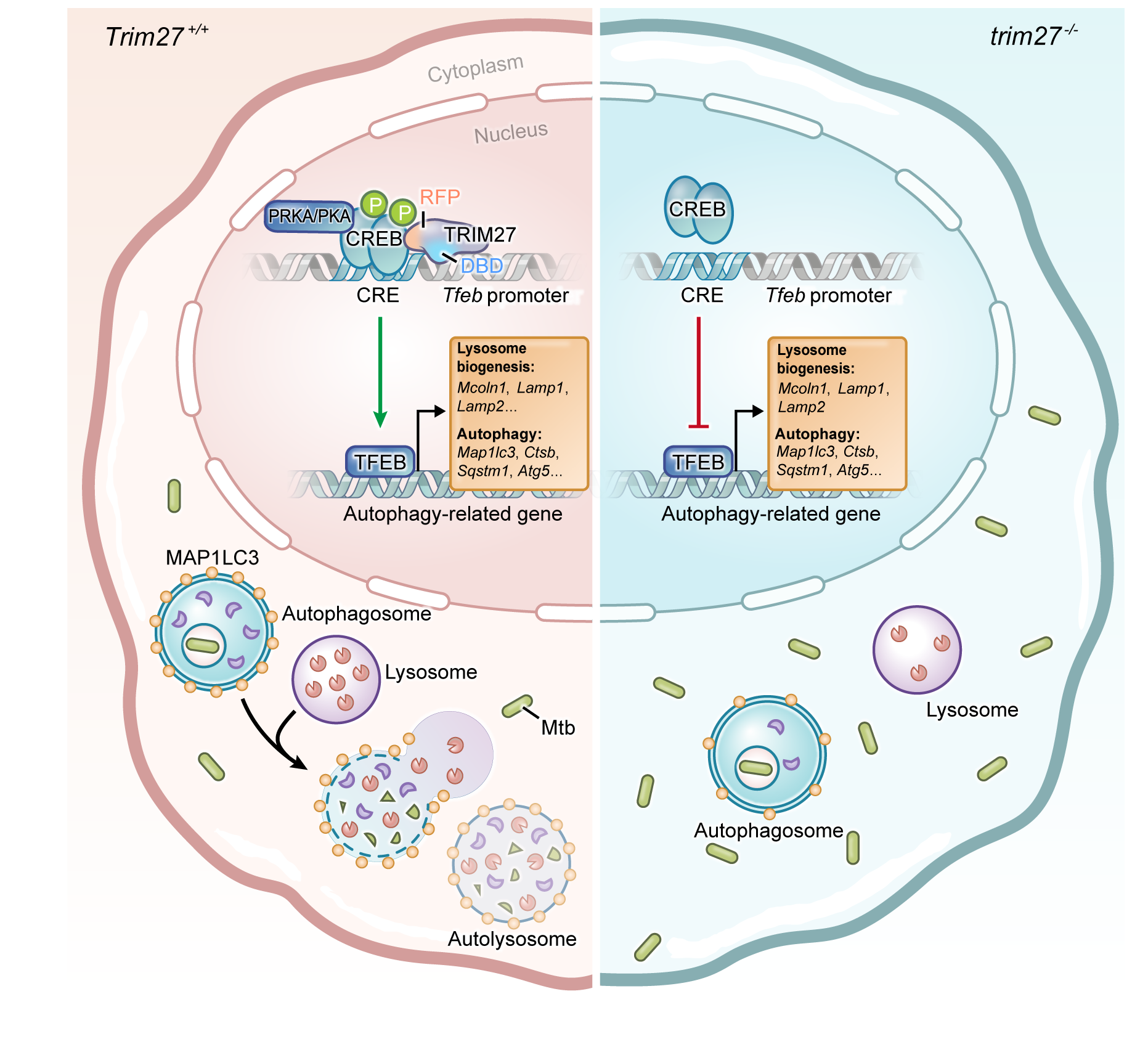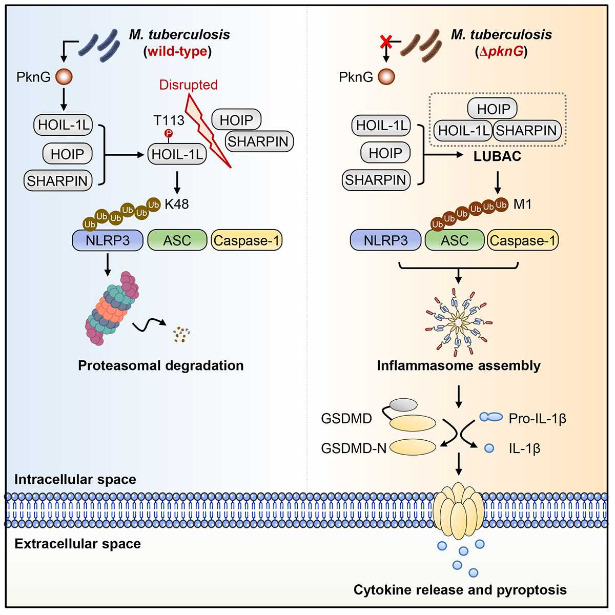 The researchers identified that PknG, a Mtb-secreted protein kinase, subverts NLRP3-mediated immune responses by disrupting linear ubiquitin chain assembly complex (LUBAC). Mechanistically, PknG phosphorylates the HOIL-1L subunit of LUBAC, preventing HOIL-1L from participating in LUBAC formation. This disruption impairs the LUBAC-dependent linear ubiquitination of the inflammasome adaptor ASC, ultimately inhibiting NLRP3 inflammasome assembly. Moreover, PknG-mediated phosphorylation concurrently activates HOIL-1L’s intrinsic E3 ubiquitin ligase activity, enabling HOIL-1L to mediate K48-linked ubiquitination and subsequent degradation of NLRP3. To sum up, through this dual-regulation mechanism that achieves the "one-stone-two-birds" effect as mentioned above, PknG can help promote the escape of Mtb from NLRP3-mediated cytoplasmic immune surveillance, thereby further facilitating the intracellular survival and infection of the pathogen.